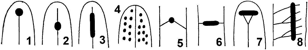 + 細胞形、色、腺毛、毛状突起有無 側糸 paraphysis (pl. -es): 胞子嚢に混じる不稔の毛状部分 (1/3の種が持つ)