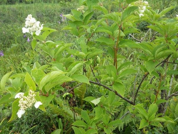 Hydrangea Gronov. (アジサイ)Noriutsugi (ノリウツギ, 糊空木), panicled hydrangeaLifeform: deciduous shrub < 5 m high Distribution: China - Japan Habitat: volcanos (→ flora on Mounts Koma and Usu), forests, shrublands, and wetlands (湿原) Field training on integrated environmental research (統合環境調査法実習) (fauna and flora 種リスト) f. debilis (Nakai ex Hara) Sugimoto (ヒダカノリウツギ, 日高糊空木), lacking ornamental flowers, distributed in Hidaka Province, Hokkaido |